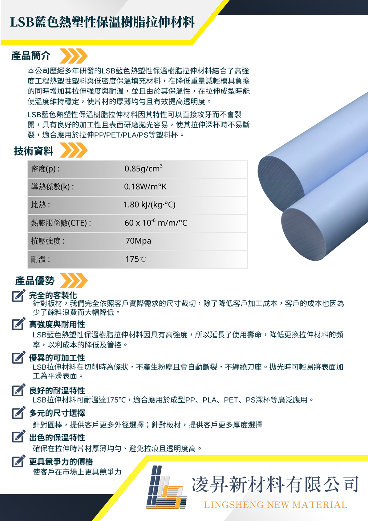 LSB藍色熱塑性保溫樹脂拉伸材料因其特性可以直接攻牙而不會裂開,具有良好的加工性且表面研磨拋光容易,使其拉伸深杯時不易斷裂,適合應用於拉PP/PET/PLA/PS等塑料杯。